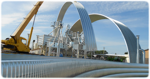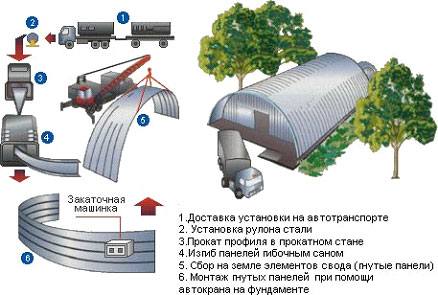 Cold-arched arched elements are made of rolled galvanized steel directly on the construction site section bending machine. With canning machine arcs together in section 5 pieces sealed seams. This technology creates a complete watertightness seaming structure (principle tin) and eliminates the need for fasteners used in frame technology. The sections are then mounted onto the prepared foundation and rolled together.